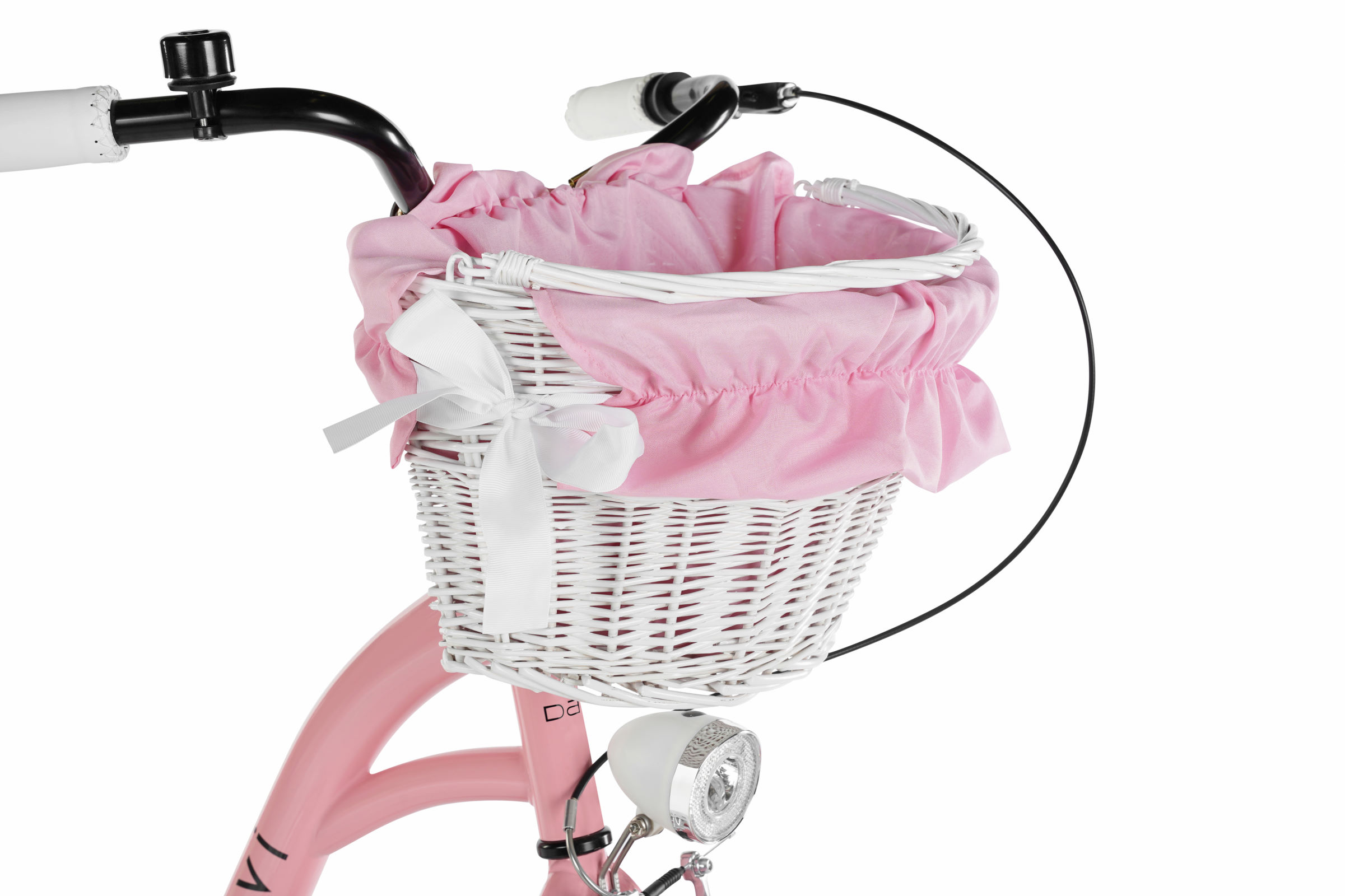 Vzadu je klasický nosič, na který můžete připevnit dětskou sedačku, další tašky nebo přepravovat jiné předměty. Kolo je vybaveno pleteným košíkem a všemi doplňky viditelnými na fotce.