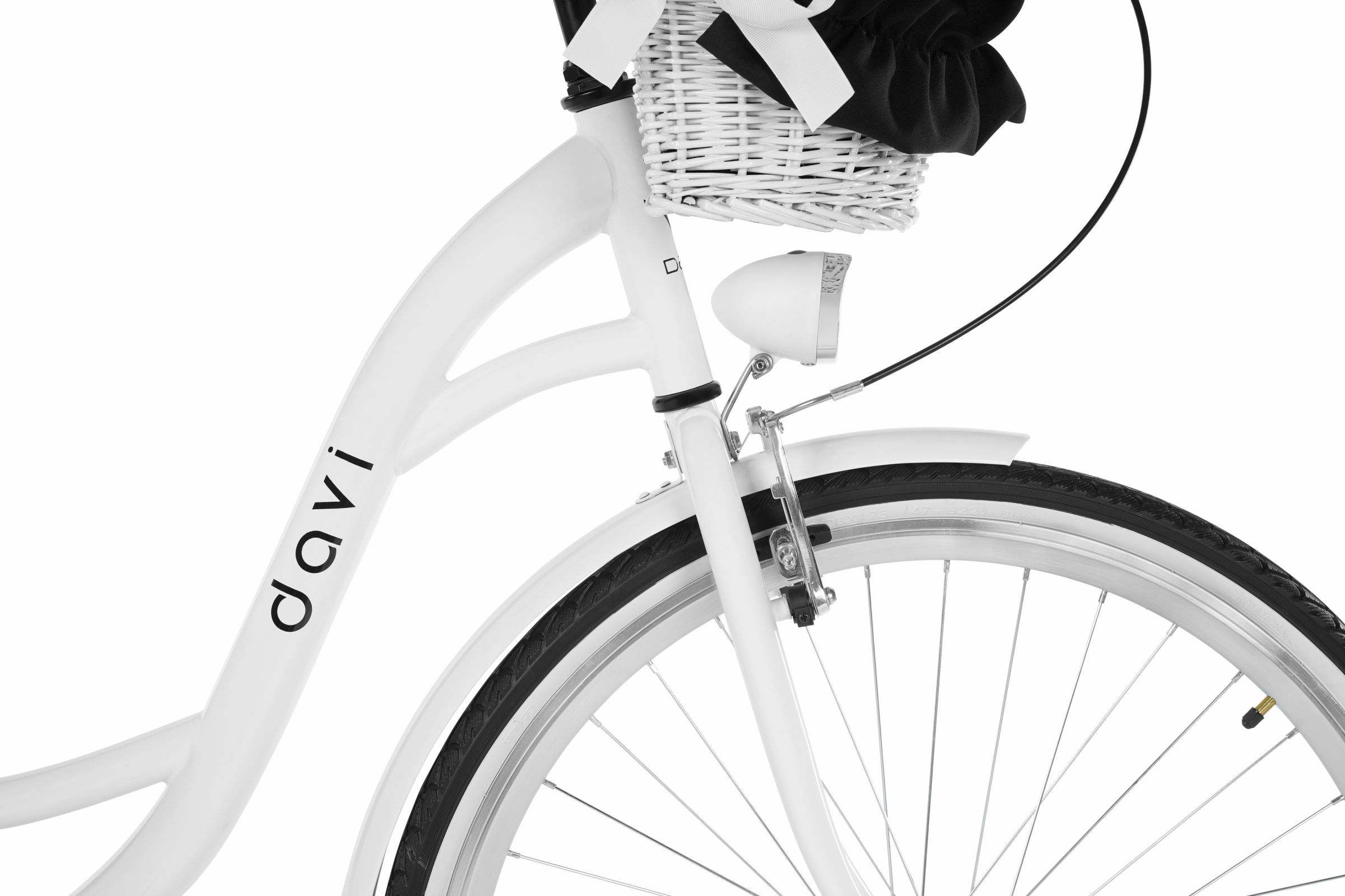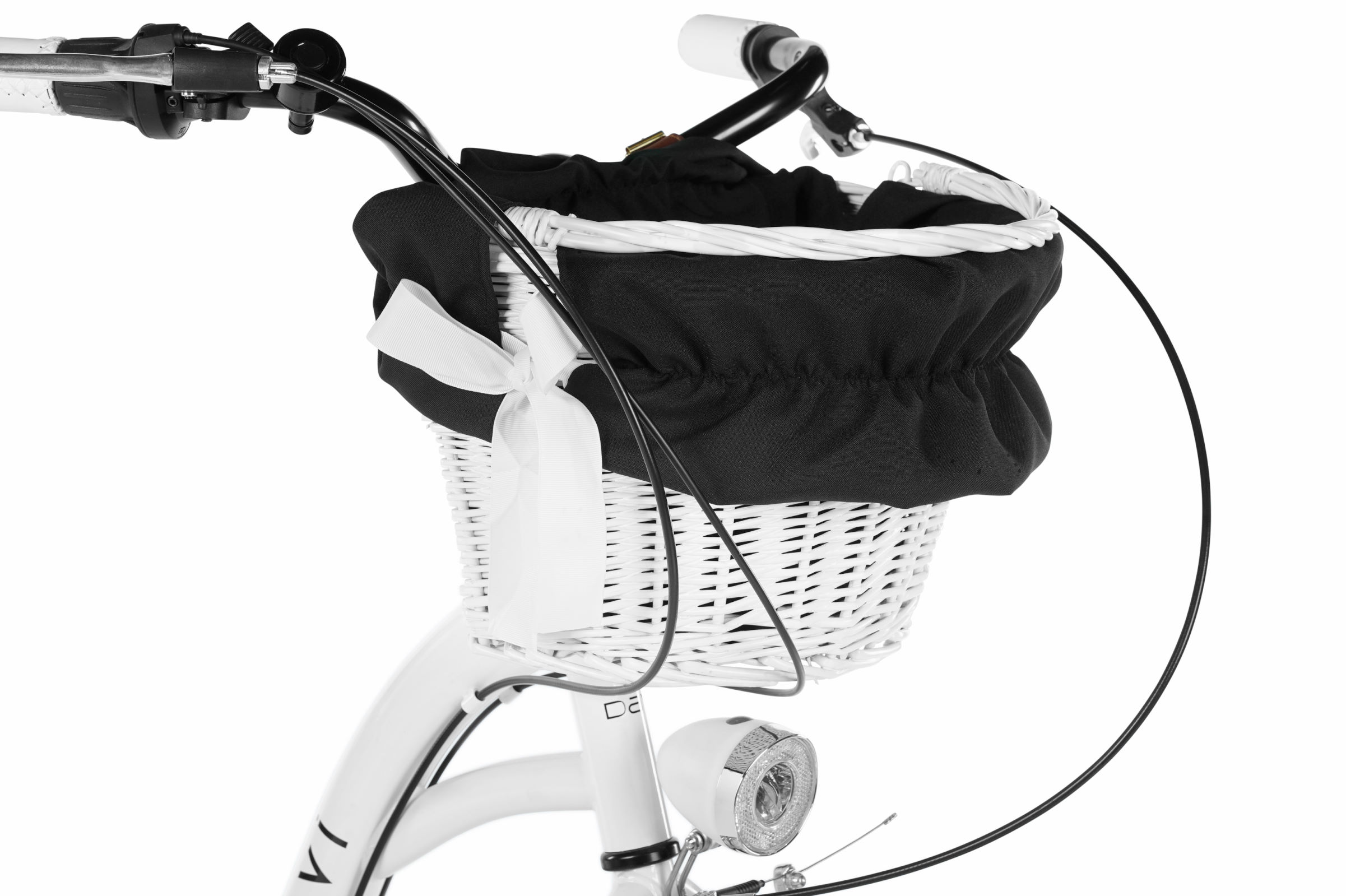 Vzadu je klasický nosič, na který můžete připevnit dětskou sedačku, další tašky nebo převážet jiné předměty. Kolo je vybaveno pleteným košíkem a všemi příslušenstvími zobrazenými na fotce.
